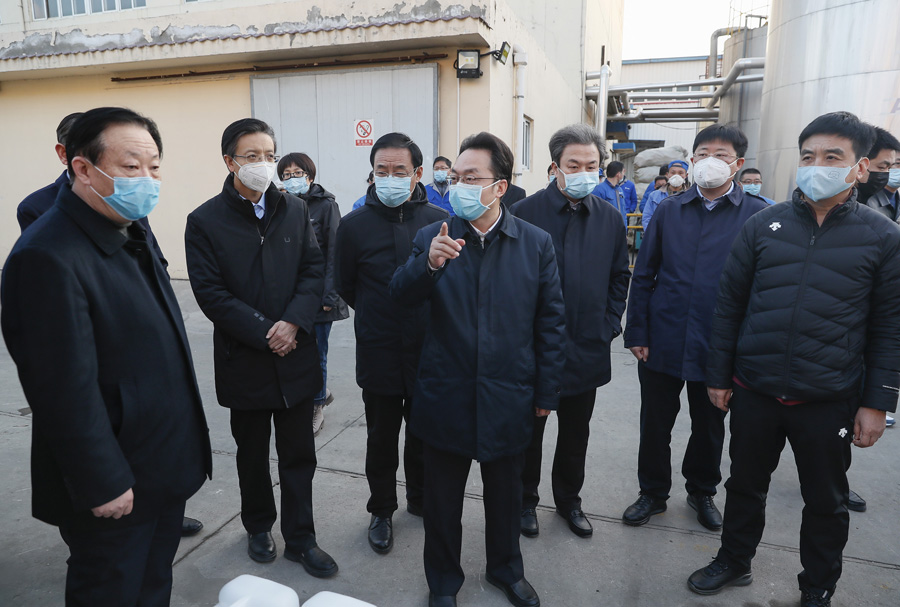 朱鵬在南風(fēng)集團(tuán)山西日化銷(xiāo)售有限公司調(diào)研消毒殺菌用品生產(chǎn)情況。 記者 閆鑫 攝