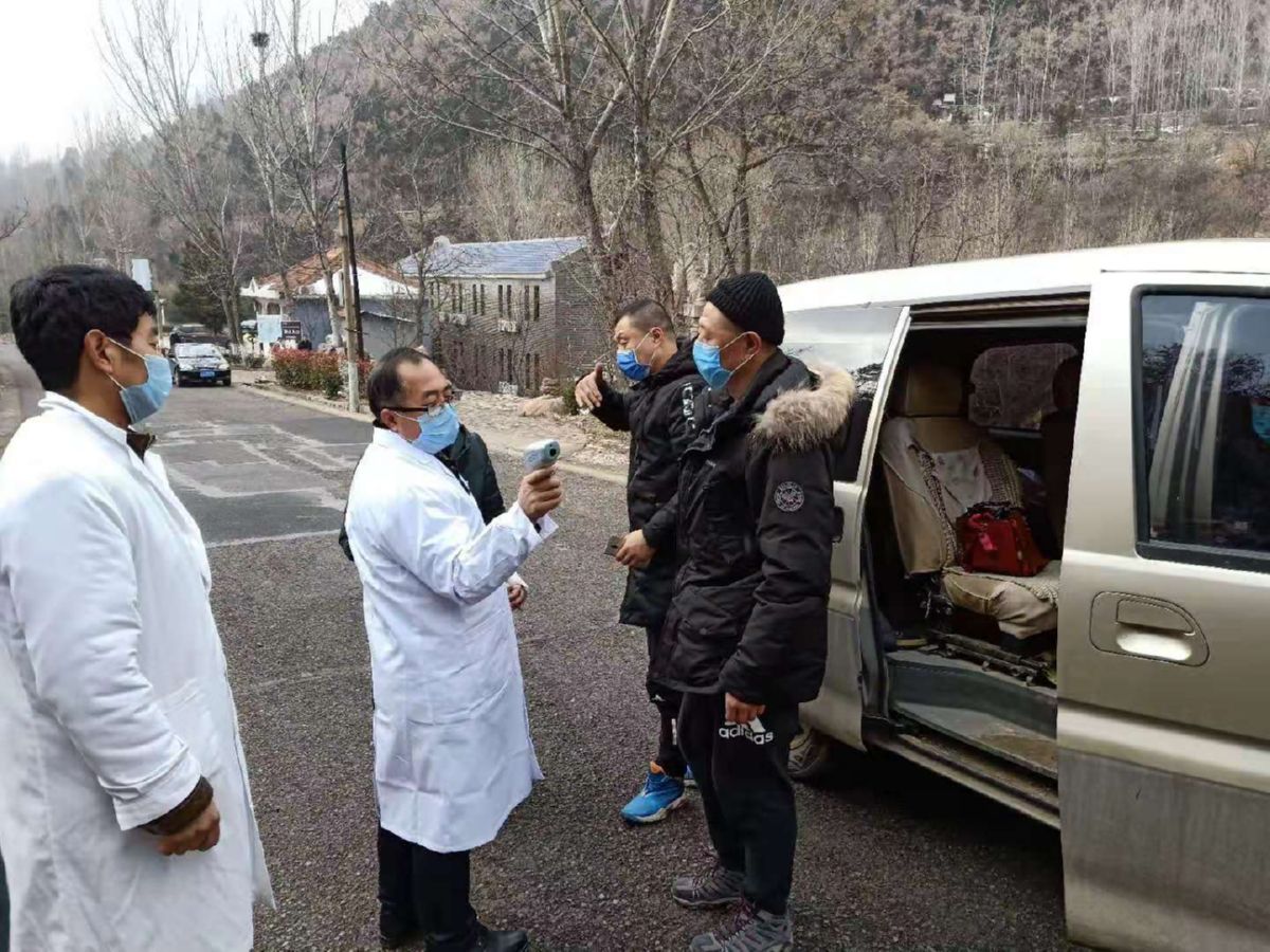 1月27日,夏縣祁家河鄉衛生院醫務人員為過往人員量體溫。
