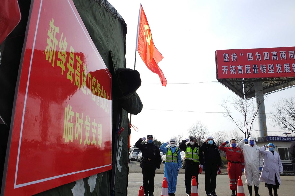 2月1日,在京昆高速公路新絳收費站的疫情檢測點,新成立的高速口臨時黨支部黨員在宣誓。