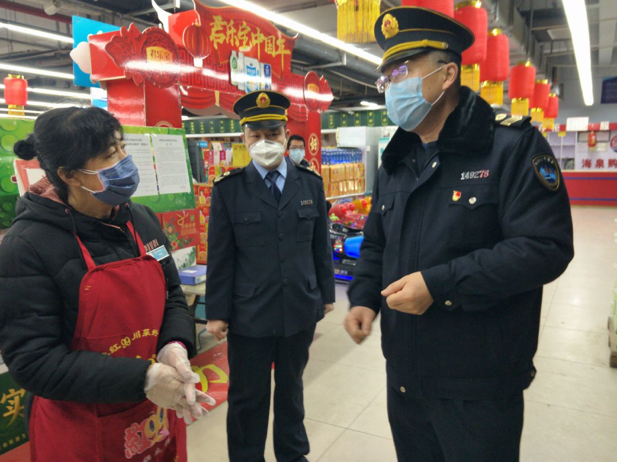 ▲執法隊員在一家超市檢查 韓福琴 攝