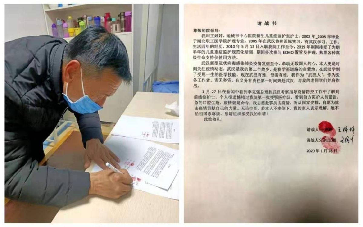 來到醫院,看著女兒在請戰書上簽名,父親“反悔”了:請戰書上也得有我的名字。說罷,他拿起筆,簽上了自己的名字,并按上了紅手印。