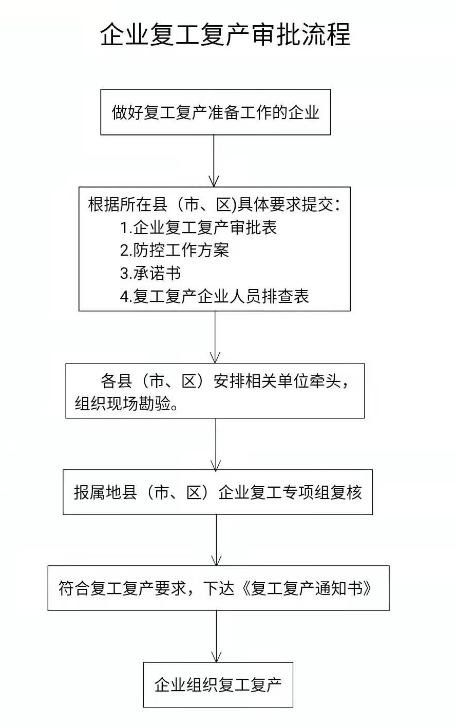 符合復工復產條件的企業,提出書面申請,提交復工復產審批表、防控工作方案、人員排查表、承諾書等相關材料。企業復工復產申請,按照屬地管理,由各縣(市、區)、運城開發區確定牽頭單位,組織現場勘驗后,符合復工復產要求的,報企業復工專項組審核后,下發復工復產通知書后方可復工復產。