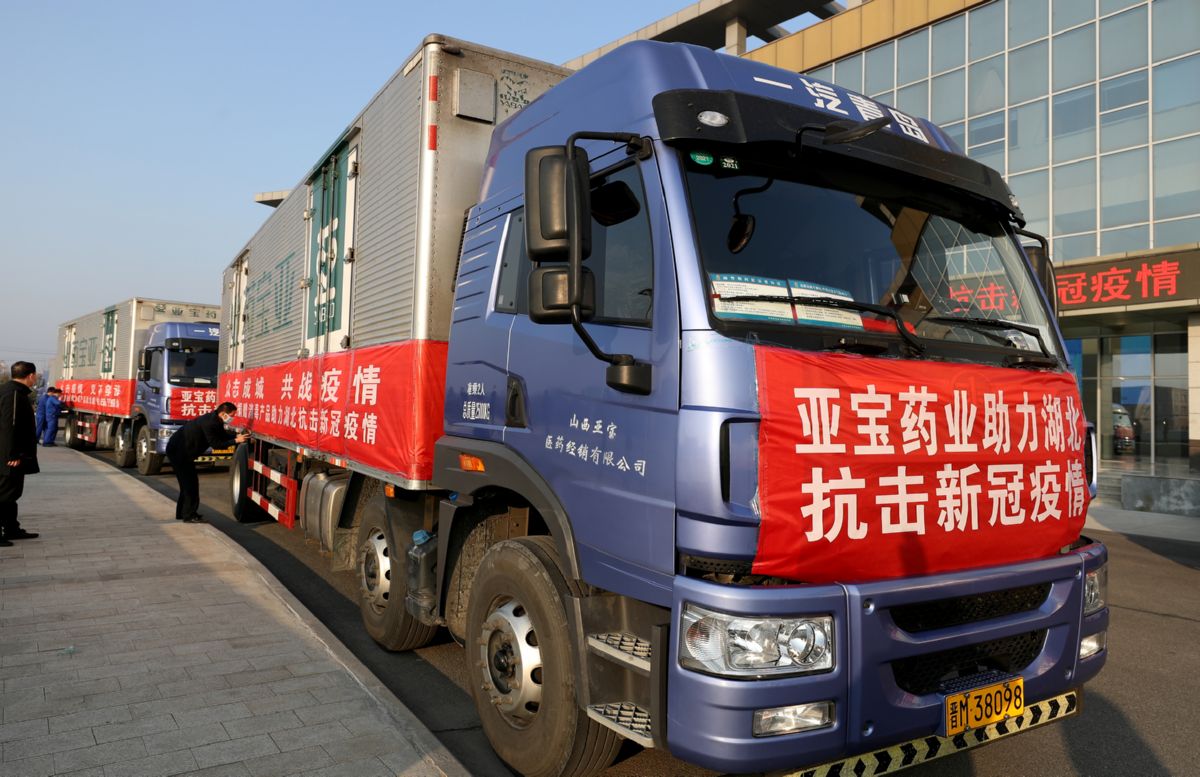圖為亞寶藥業贈送給疫區的50噸消毒液送往湖北。記者 雷哲俠 攝