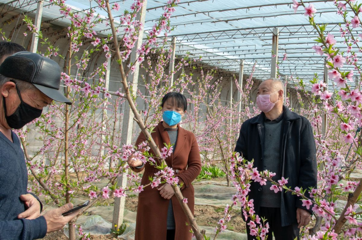 ▲2月19日,萬安鎮黨委書記衛紅鴿(中)在油桃大棚內指導生產。 宋磊 攝