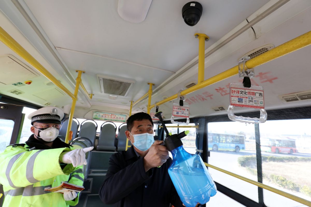 2月17日,民警督促駕駛員做好公交車扶手的消毒工作。