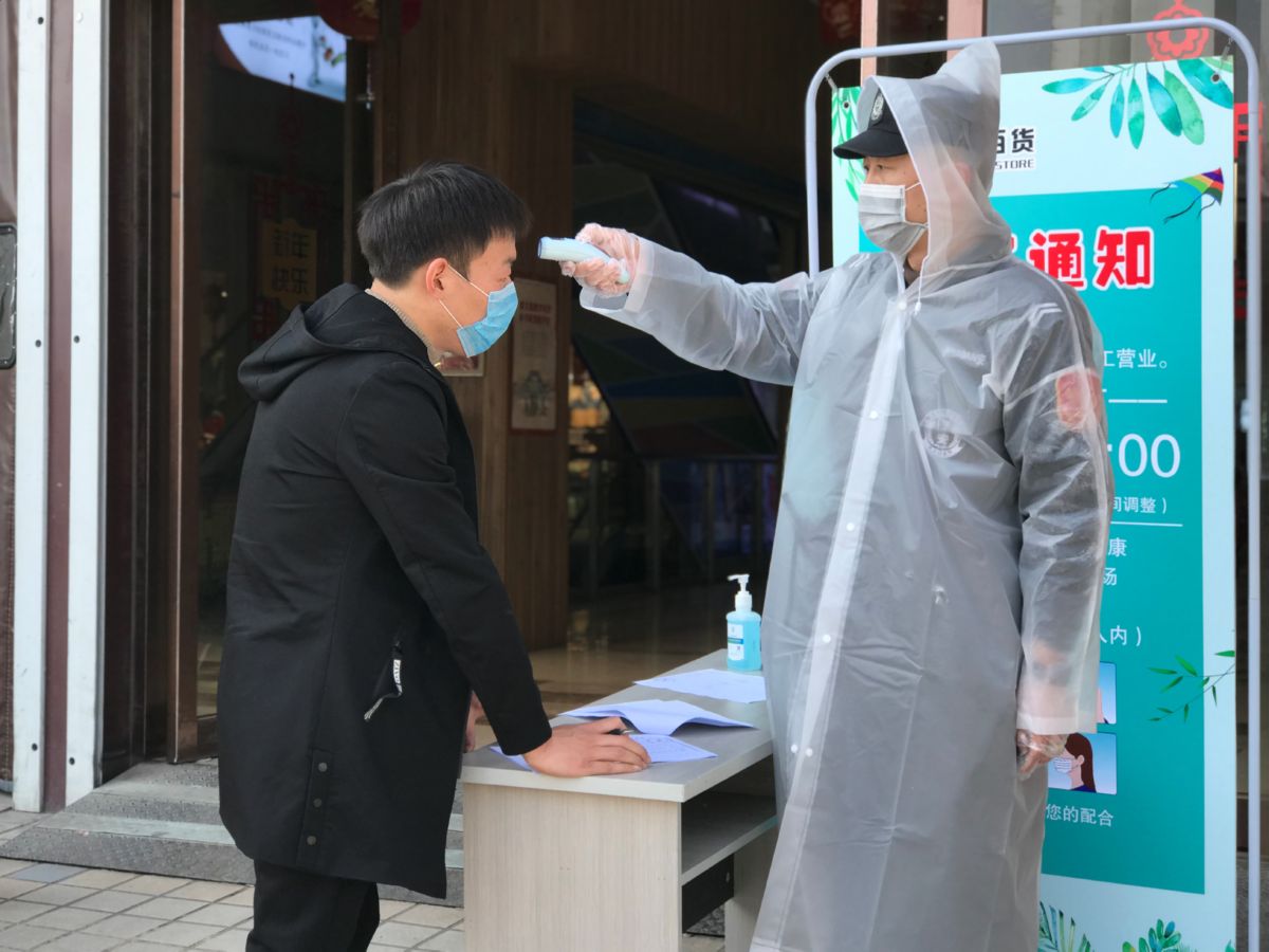 ▲在市區(qū)南風百貨出入口,工作人員為顧客測量體溫。王棉 攝