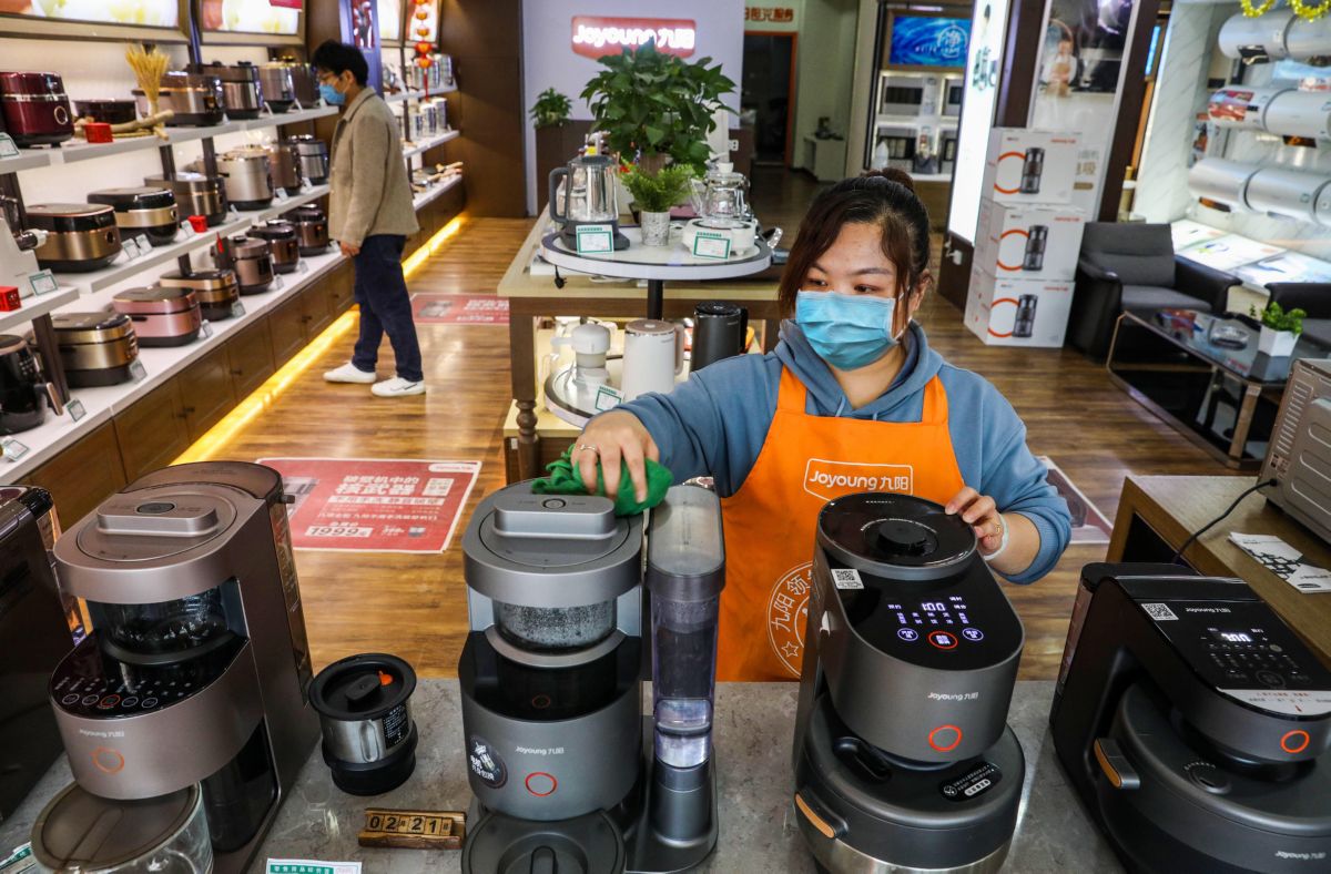 2月23日,九陽(yáng)家電水岸華庭店員工在整理貨品,開門營(yíng)業(yè)。 記者 馮革才金玉敏 攝影報(bào)道