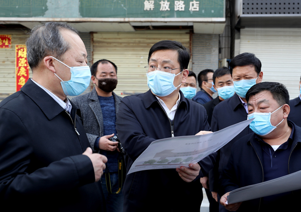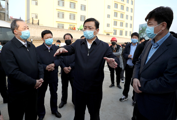 在解放南路提升改造工程現場,丁小強測量體溫后,進入施工現場,實地查看道路管網和人行道的鋪設,詳細聽取了市住建局負責人對該路段綠化設計、今年城建重點項目、中心城區棚戶區改造等情況匯報。他指出,要進一步提升街道綠化檔次,做到栽養一體化、喬灌木相結合,打造層次感鮮明的城市綠色景觀。要加快中心城區與臨猗縣連接道路建設,實現路網互連互通,早日形成鹽臨夏一體化發展的大路網;著力打通中心城區道路微循環,建設安全暢通、高效快捷的中心城區路網,讓群眾出行更便捷高效。