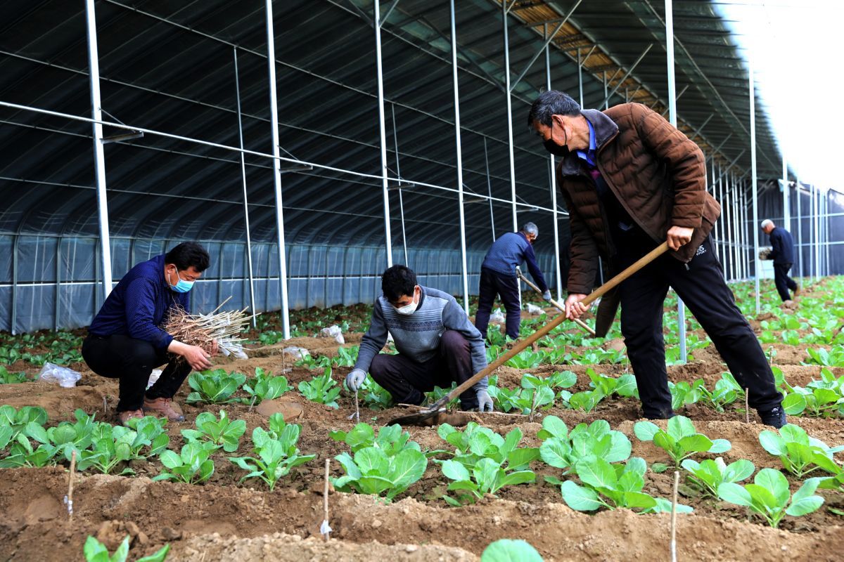 2月23日,夏縣瑤峰鎮南關村村民在設施大棚茴子白行間栽植油桃樹。