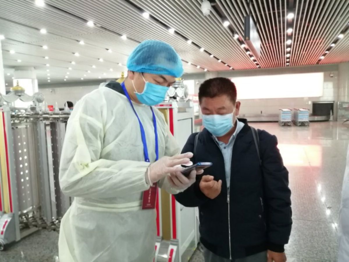 ▲2月28日,市農經中心志愿者(左)在運城機場幫助旅客填報個人行程及健康信息。