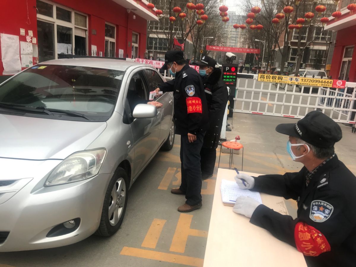 3月3日,鹽湖區(qū)東城辦槐東社區(qū)槐東花園門口,保安師傅在對進(jìn)出小區(qū)的車進(jìn)行檢查登記,60歲的李治民用額溫槍測溫。