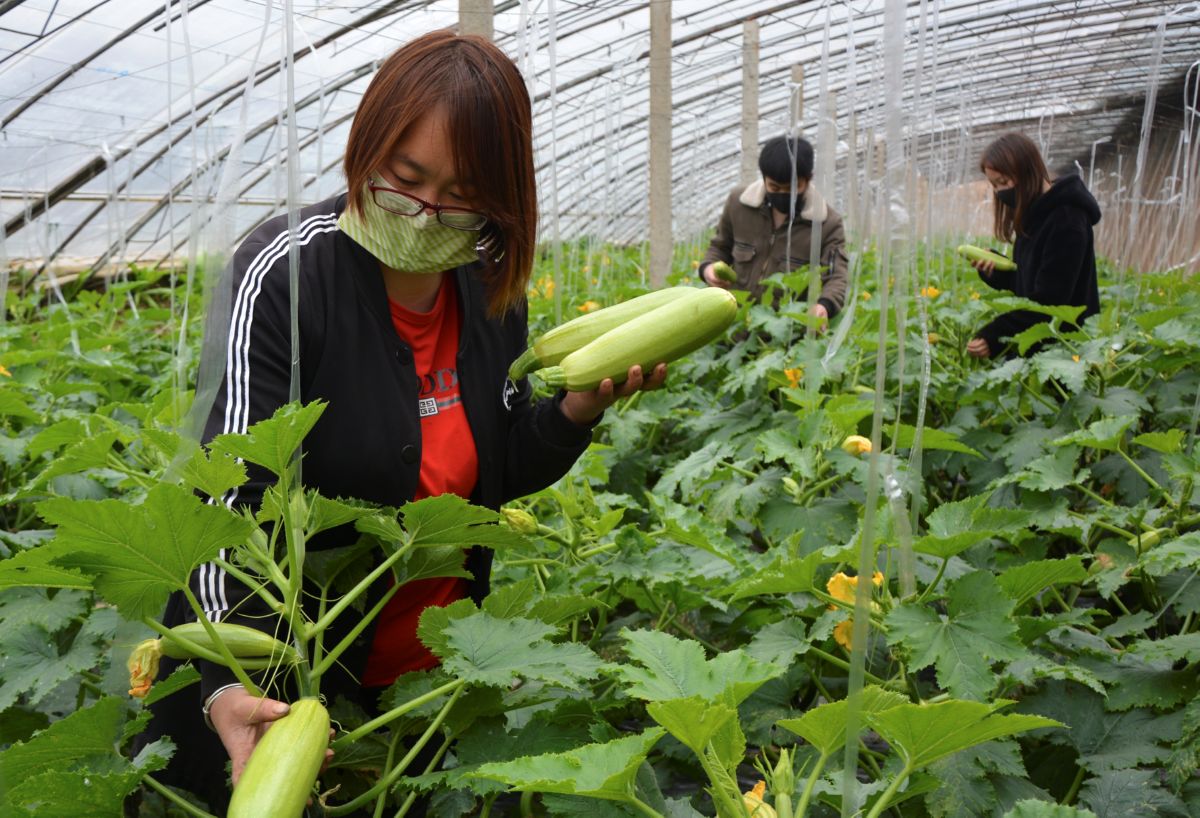 3月5日,鹽湖區(qū)大渠辦北孫塢村村民梁菊萍在大棚內(nèi)采摘西葫蘆。