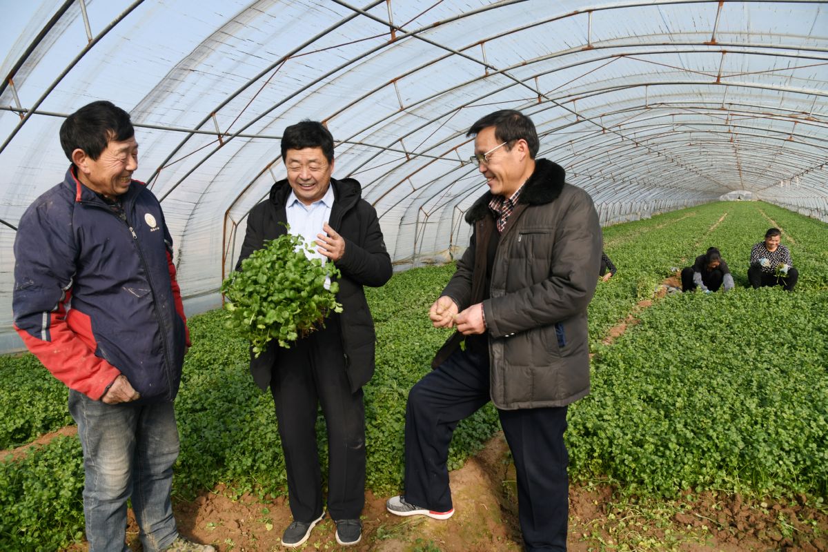 3月6日,聞喜縣桐城鎮上邱村干部在大棚內向村民了解蔬菜生產情況。