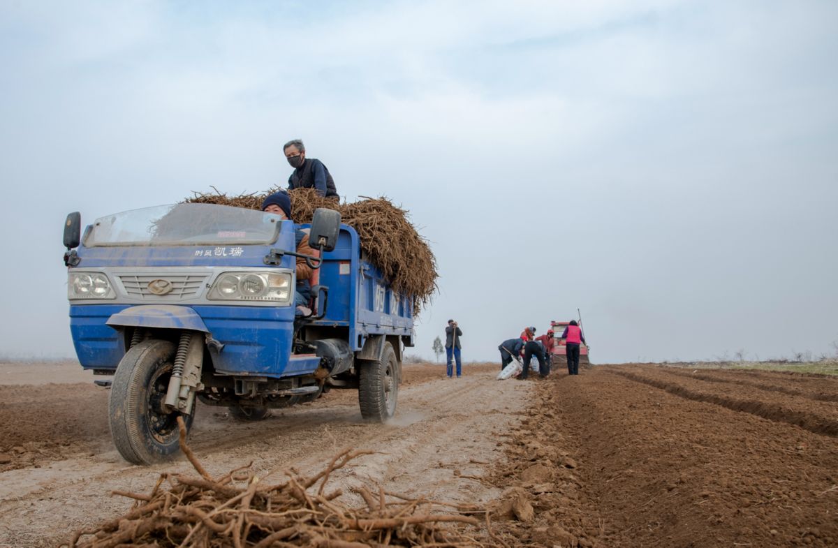 3月9日,新絳縣橫橋鎮曲村村民在收獲中藥材黃芩。
