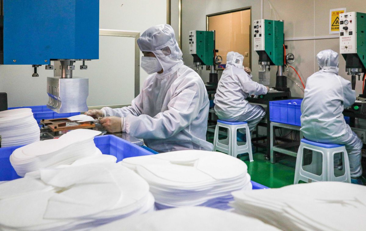 3月12日,山西嘉沃醫(yī)療器械有限公司的工人們在生產(chǎn)KN95口罩。