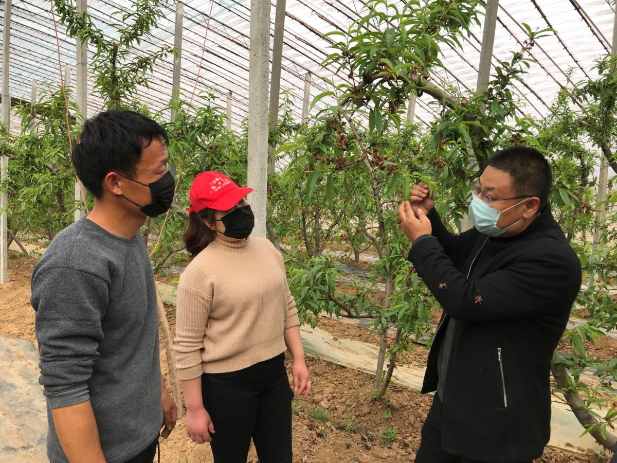 3月13日,在新絳縣萬安鎮杜莊村村民劉陽的大棚油桃田里,農技人員馮玉麟在為劉陽夫婦講解大棚油桃的病害防治知識。