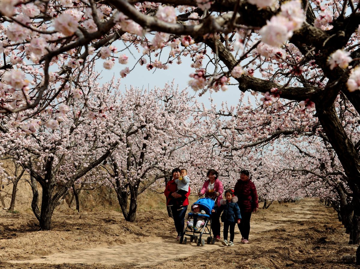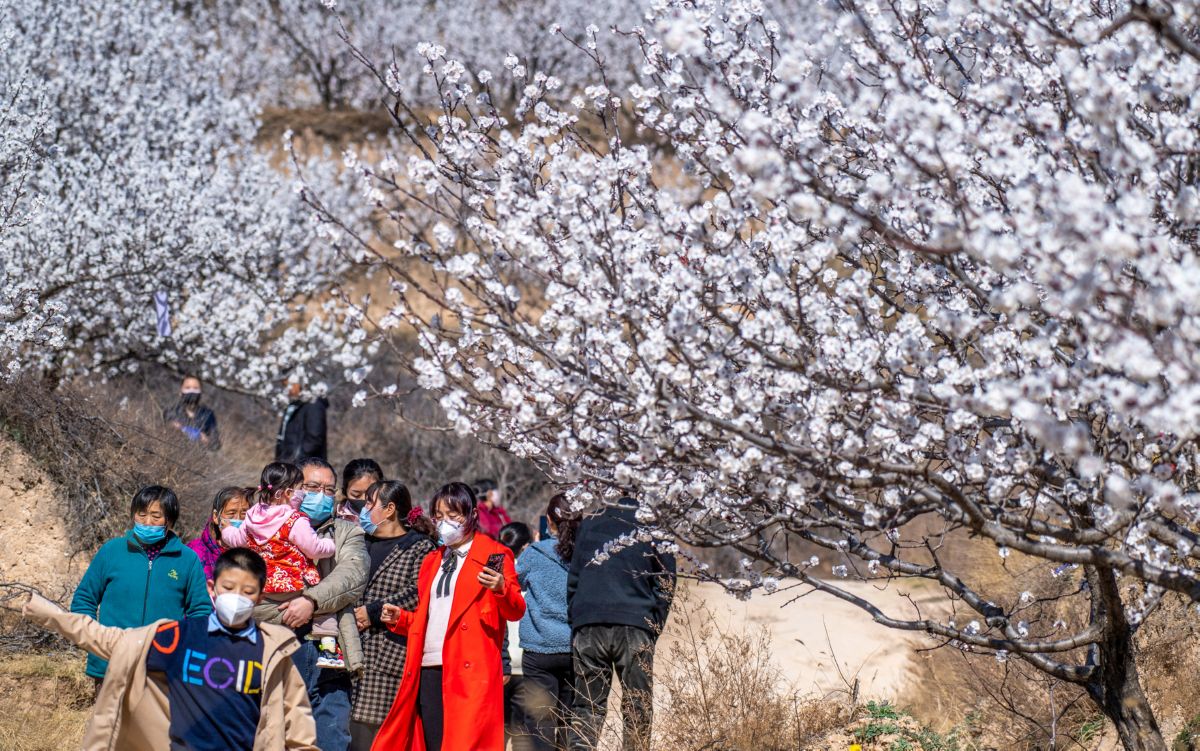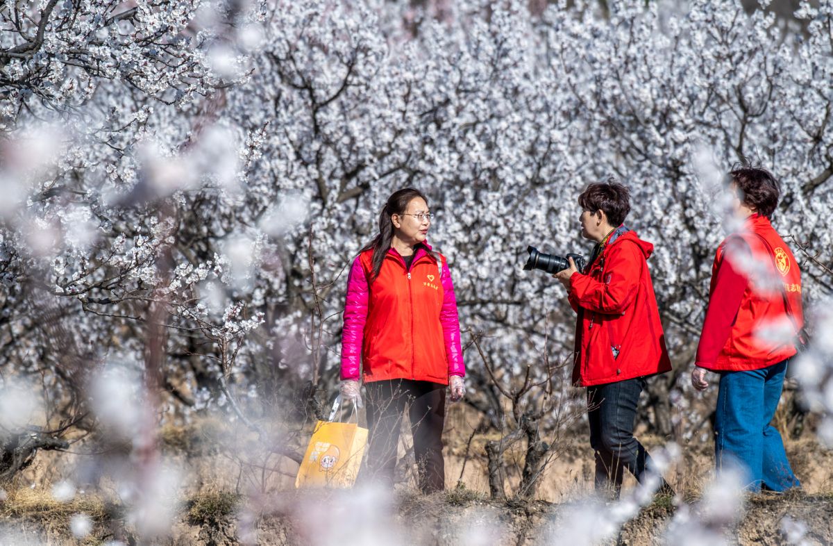 ▲3月13日,游客在杏花林中踏青賞花