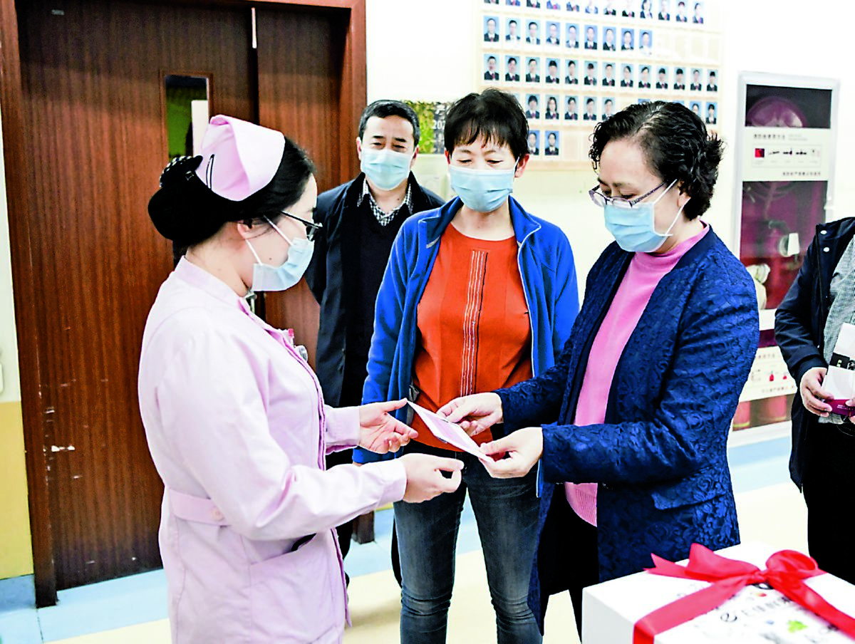 ▲市中心醫(yī)院黨委書記、院長高萍,帶隊慰問支援湖北醫(yī)療隊隊員家屬。 記者 王耀 攝