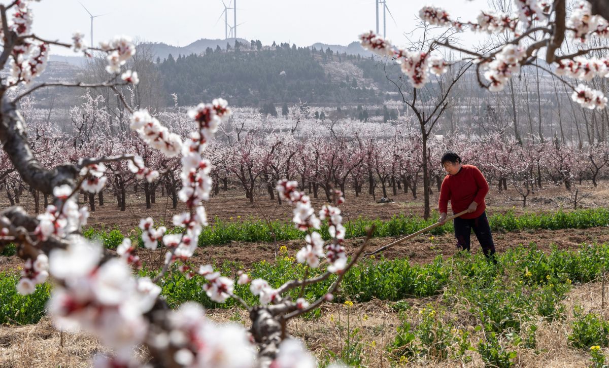 平陸縣常樂鎮前溝村村民在杏花園里耕田松土。 特約攝影 劉文禮