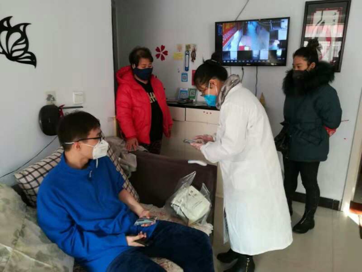 ▲社區工作人員和醫務人員對居家隔離人員監測體溫 王棉 攝
