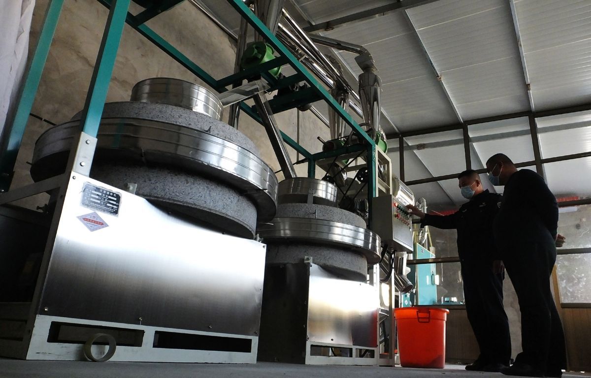 3?月?17?日,新絳縣古交鎮(zhèn)閆家莊村駐村第一書記張衛(wèi)東(左)和村干部在新建的扶貧車間,查看石磨面粉機磨出的面粉質量。