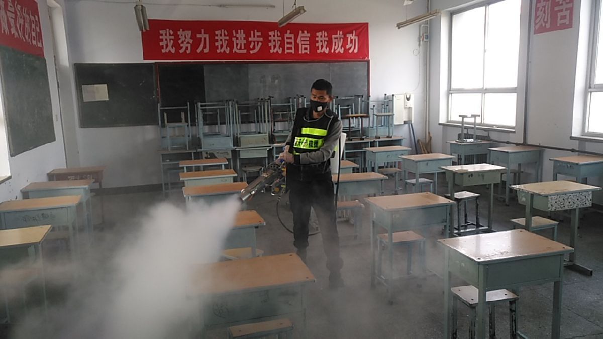 ▲3月18日,萬(wàn)榮縣藍(lán)天救援隊(duì)志愿者在該縣校園內(nèi)進(jìn)行消殺作業(yè)。