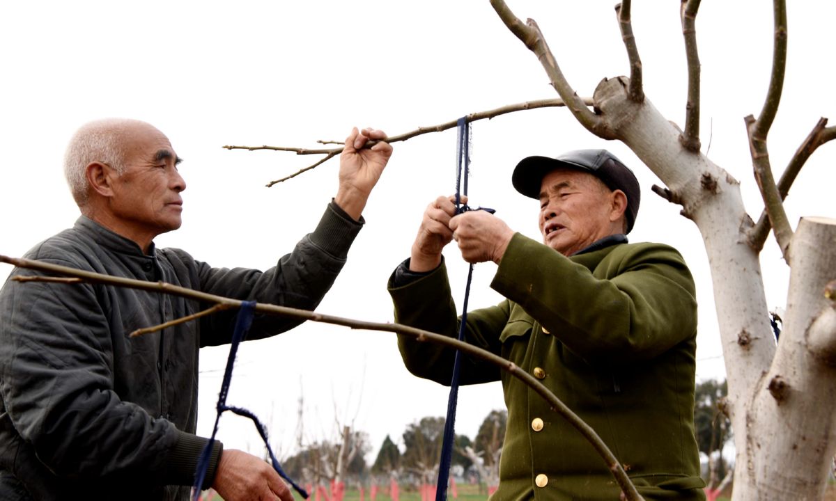 3月21日,垣曲縣華峰村一村民在技術員的指導下,為核桃樹整形拉枝。