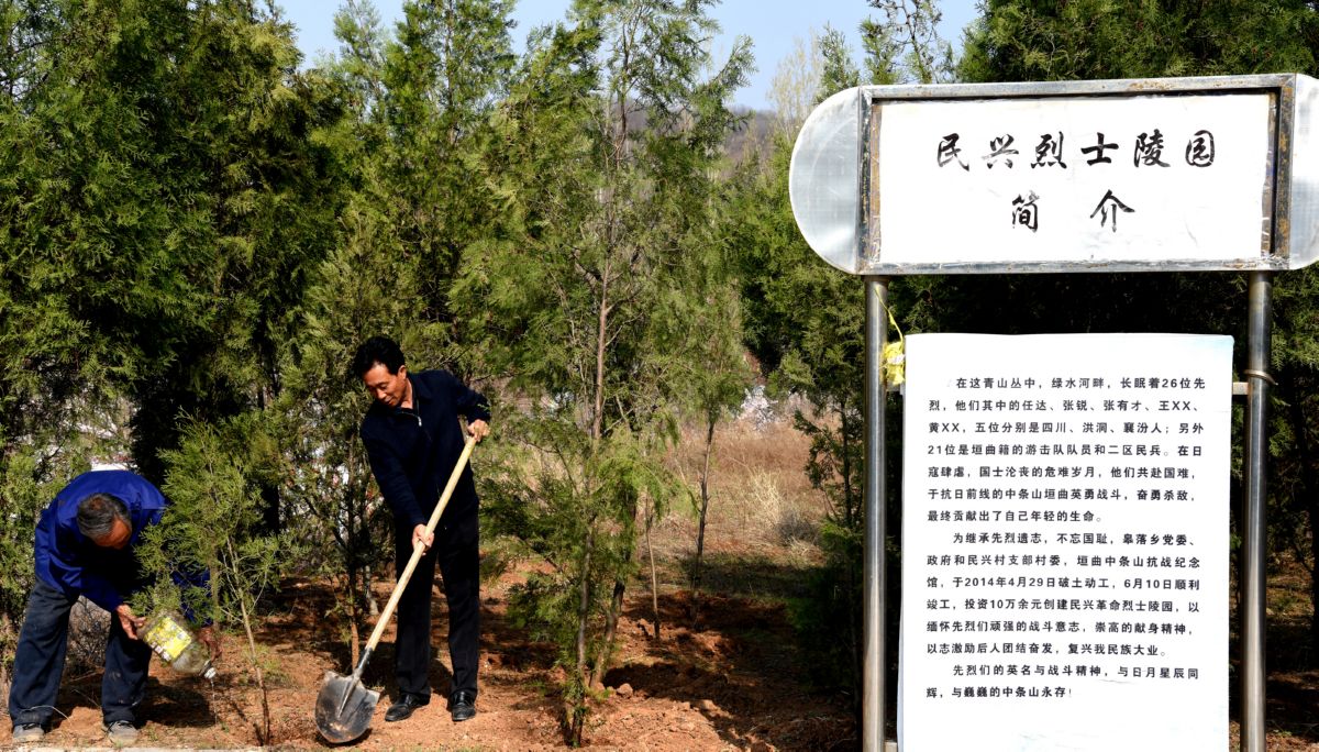 3月24日,垣曲縣中條山抗戰紀念館館長楊金玉(右)在民興烈士陵園為新栽的松柏培土澆水。