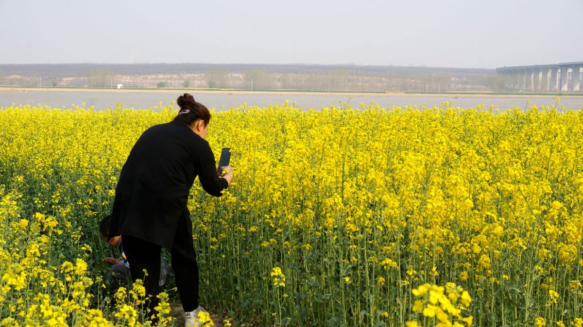 近日,游客在芮城縣陌南鎮圣天湖黃河岸邊的油菜花地里賞花、拍抖音。 董應贊 攝