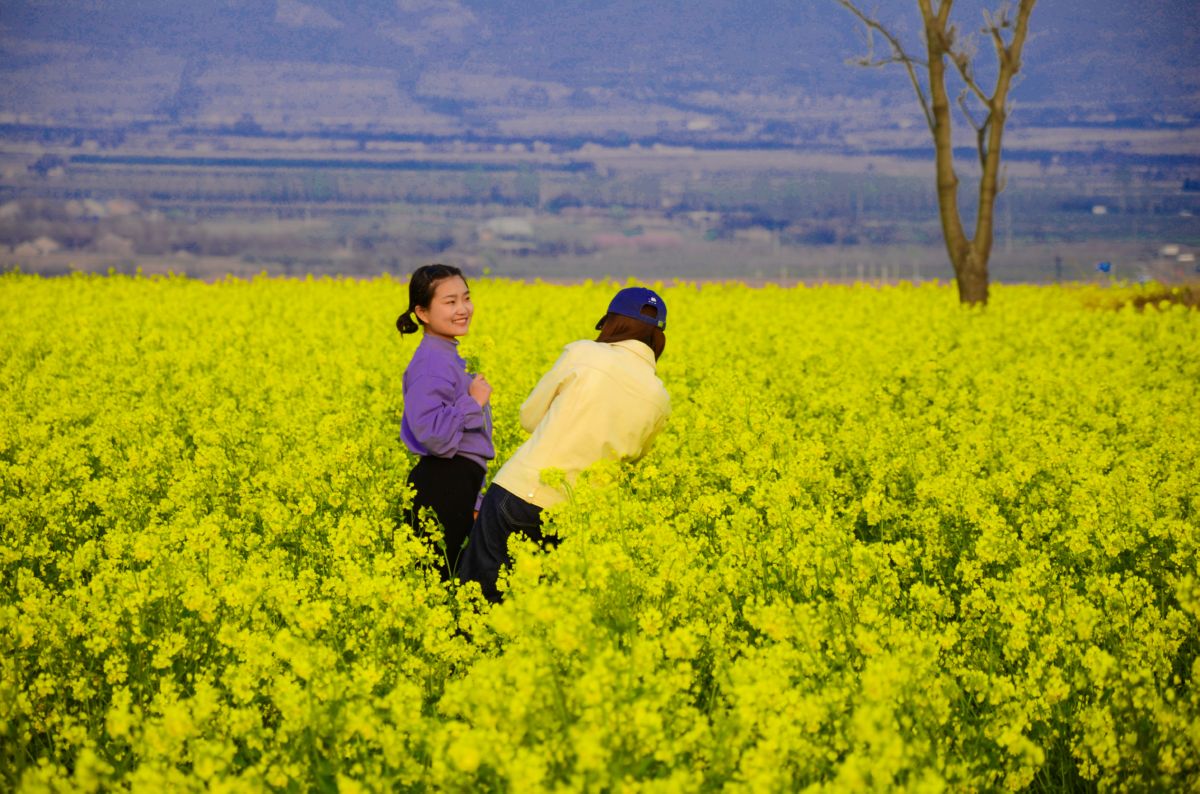 3月29日,游客在萬榮縣南月生態(tài)公園的百畝油菜花園里賞花、拍照、放風(fēng)箏,一派春和景明、安康吉祥的生動景象。