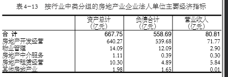 2018年末,全市房地產業企業法人單位的資產總計為667.75億元,比2013年末增長79.41%。其中,房地產開發經營企業640.27億元,物業管理企業14.09億元,房地產中介服務企業1.11億元,房地產租賃經營10.30億元,分別比2013年末增長78.20%,172.34%,487.78%和63.26%。負債合計558.69億元。全年實現營業收入80.81億元(詳見表4-13)。