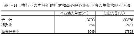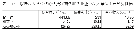 在租賃和商務服務業企業法人單位中,租賃業占17.66%,商務服務業占82.34%。在租賃和商務服務業企業法人單位從業人員中,租賃業占12.1%,商務服務業占87.9%(詳見表4-14)。