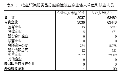 建筑業企業法人單位從業人員63482人,內資企業占99.94%。其中,國有企業占內資企業的5.73%,集體企業占2.32%,私營企業占62.27%(詳見表3-5)。