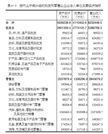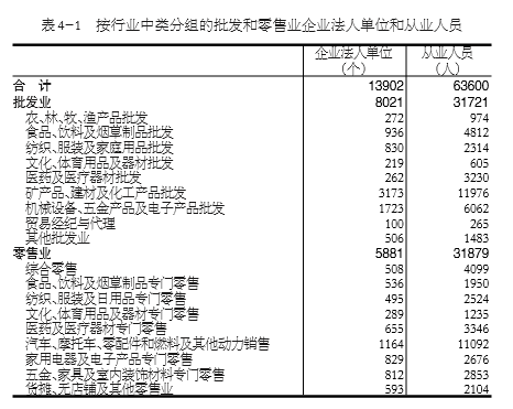 在批發和零售業企業法人單位中,批發業占57.70%,零售業占42.30%。在批發和零售業企業法人單位從業人員中,批發業占49.88%,零售業占50.12%(詳見表4-1)。