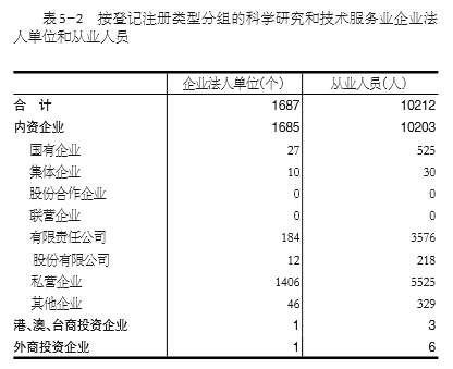 在科學研究和技術服務業企業法人單位從業人員中,內資企業占99.91%,港、澳、臺商投資企業占0.03%,外商投資企業占0.06%(詳見表5-2)。