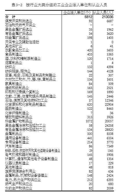 在工業企業法人單位從業人員中,采礦業占6.44%,制造業占89.27%,電力、熱力、燃氣及水生產和供應業占4.29%。在工業行業大類中,有色金屬冶煉和壓延加工業、黑色金屬冶煉和壓延加工業、化學原料和化學制品制造業從業人員數位居前三位,分別占13.53%、11.39%和10.75%(詳見表3-2)。