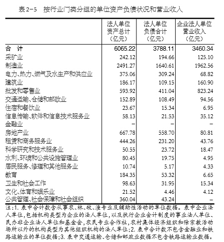 2018年末,全市第二產業和第三產業法人單位資產總計6065.22億元,法人單位負債合計3788.11億元;2018年企業法人單位實現營業收入3460.34億元(不含金融業、鐵路運輸業單位數據)(詳見表2-5)。
