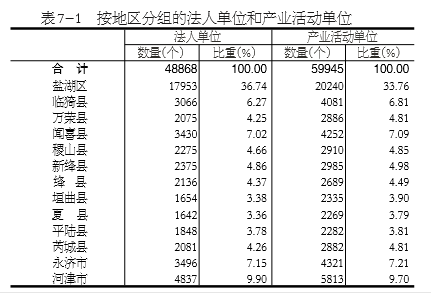 2018年末,在第二產業和第三產業法人單位中,位居前三位的地區是:鹽湖區17953個,占36.74%;河津市4837個,占9.90%;永濟市3496個,占7.15%。