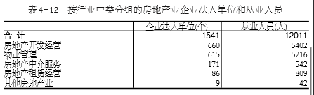 2018年末,全市共有房地產業企業法人單位1541個,比2013年末增長124.31%,從業人員為12011人,比2013年末下降9.09%。在房地產企業法人單位中,房地產開發經營業占42.83%,物業管理占39.91%,房地產中介服務占11.10%,房地產租賃經營占5.58%。在房地產企業法人單位從業人員中,房地產開發經營業占44.98%,物業管理占43.43%,房地產中介服務占4.51%,房地產租賃經營占6.74%(詳見表4-12)。