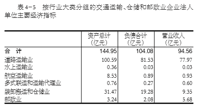 2018年末,交通運輸、倉儲和郵政業企業法人單位資產總計144.95億元,比2013年末下降42.30%。負債合計104.08億元。全年實現營業收入94.56億元(詳見表4-5)。