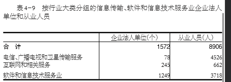 2018年末,全市共有信息傳輸、軟件和信息技術服務業企業法人單位1572個,從業人員8906人,分別比2013年末增長2114.08%和71.67%(詳見表4-9)。