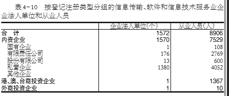 在信息傳輸、軟件和信息技術服務業企業法人單位從業人員中,內資企業占84.54%,港、澳、臺商投資企業占15.35%,外商投資企業占0.11%(詳見表4-10)。