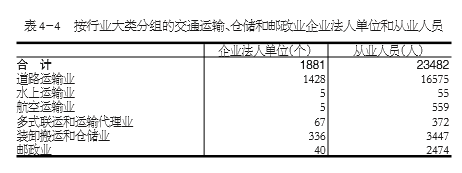 2018年末,全市共有交通運輸、倉儲和郵政業企業法人單位1881個,從業人員23482人,分別比2013年末增長184.14%和4.49%(詳見表4-4)。