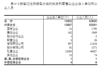 在批發和零售業企業法人單位從業人員中,內資企業占99.99%,港、澳、臺商投資和外商投資企業占0.01%。(詳見表4-2)。