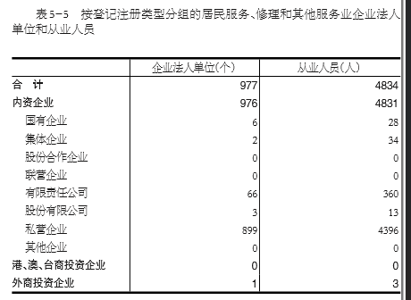 在居民服務、修理和其他服務業企業法人單位從業人員中,內資企業占99.94%,外商投資企業占0.06%(詳見表5-5)。