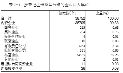 2018年末,全市共有第二產業和第三產業的企業法人單位38752個,比2013年末增加26790個,增長223.96%。其中,內資企業占99.88%,港、澳、臺商投資企業占0.03%,外商投資企業占0.09%。內資企業中,國有企業占全部企業法人單位的0.68%,私營企業占89.25%(詳見表2-3)。