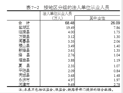 在法人單位從業人員中,位居前三位的地區依次是:鹽湖區19.49萬人;河津市9.69萬人;聞喜縣5.35萬人。