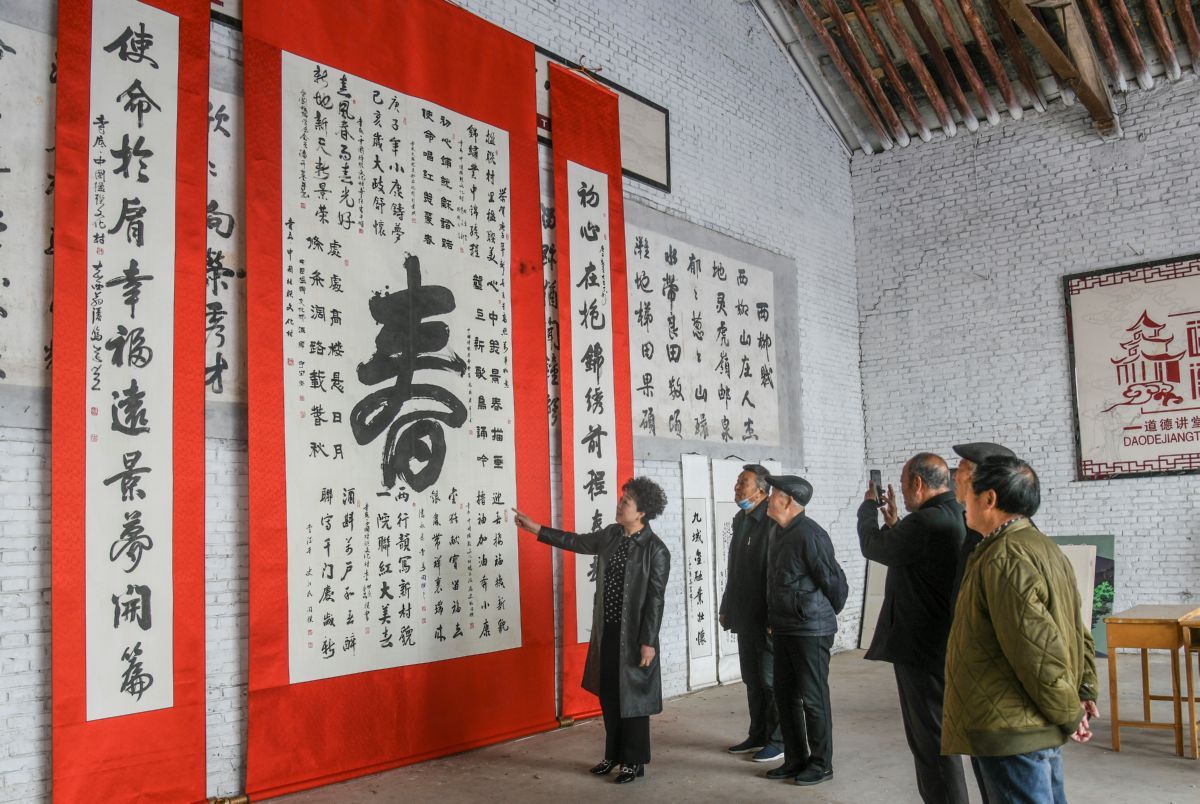 由“中國楹聯文化村”聞喜縣侯村鄉寺底村創作的巨幅“眾星捧月”式中堂以“春”為主題,長5米,寬4米,由寺底村詩聯分會的14名會員集體創作書寫,內涵豐富,時代感強,表達了村民們對美好春天的期許,對幸福生活的憧憬。 特約攝影 溫徐旺 攝影報道