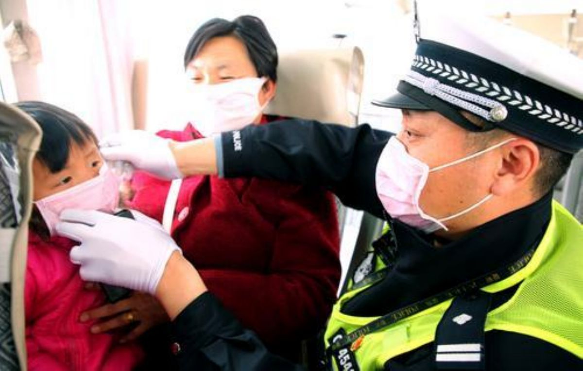 3月27日16時許,永濟交警虞鄉交警中隊民警檢查一輛客運班車,發現一位小朋友沒戴口罩,中隊負責人樊國成將自己備用的一次性醫用口罩給小朋友戴上。
