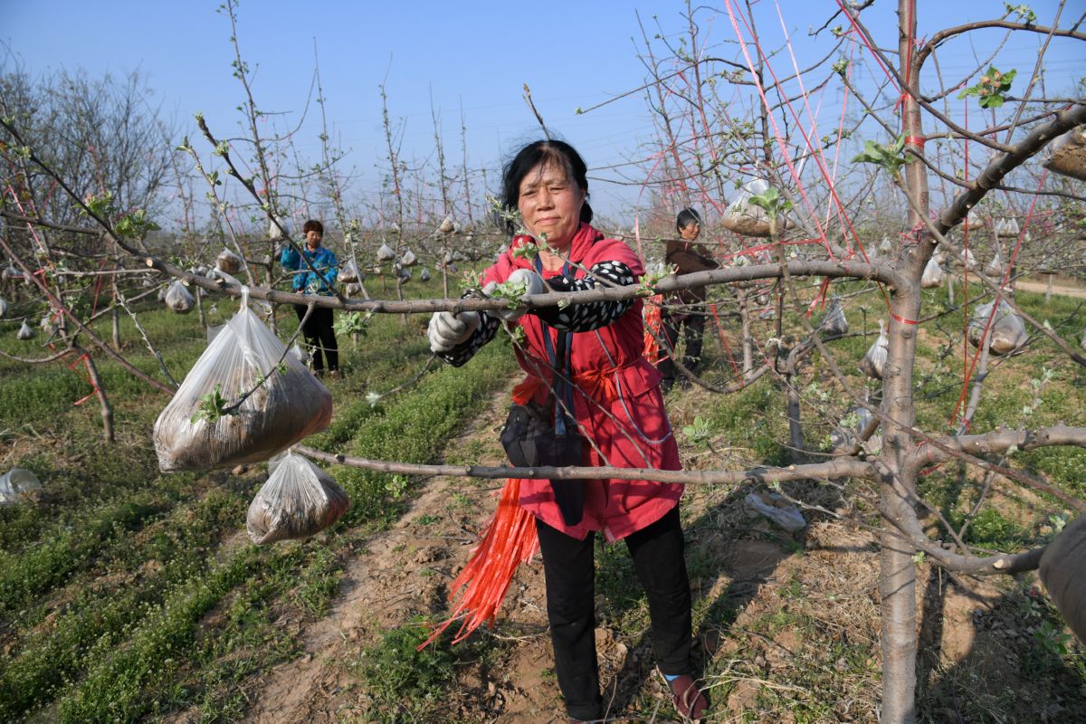 4月8日,在聞喜縣東鎮倉底村天潤盛家庭農場打工的村民在為蘋果樹整枝。